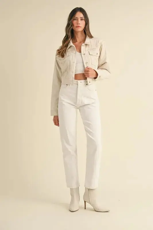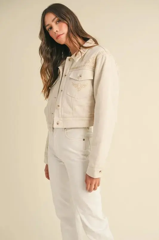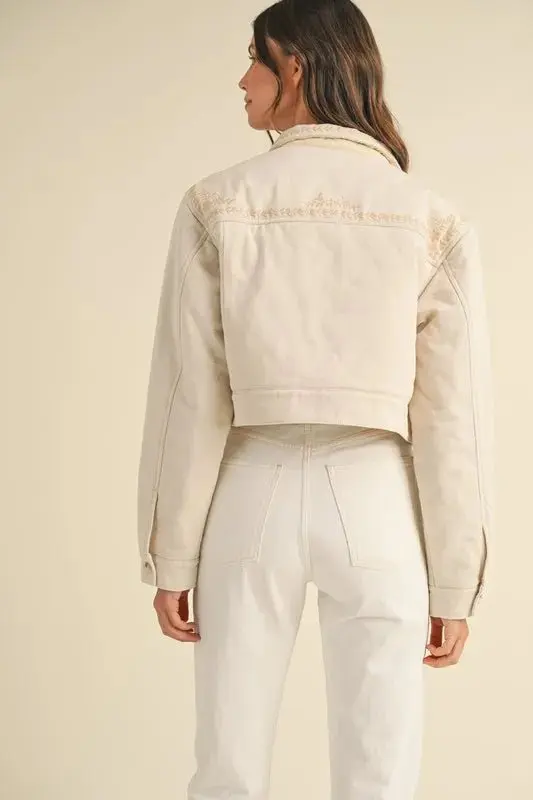The Embroidered Cropped Jacket is a stylish outerwear piece with intricate embroidery and a quilted texture. It's a chic option for layering over outfits.