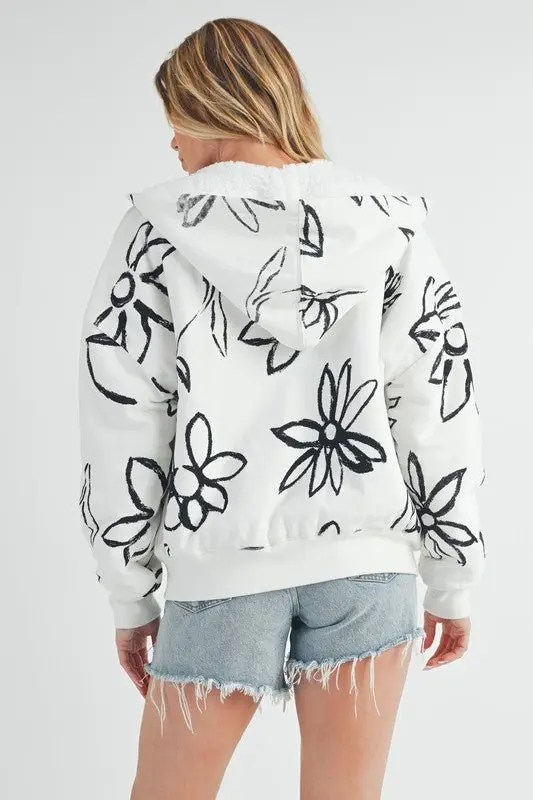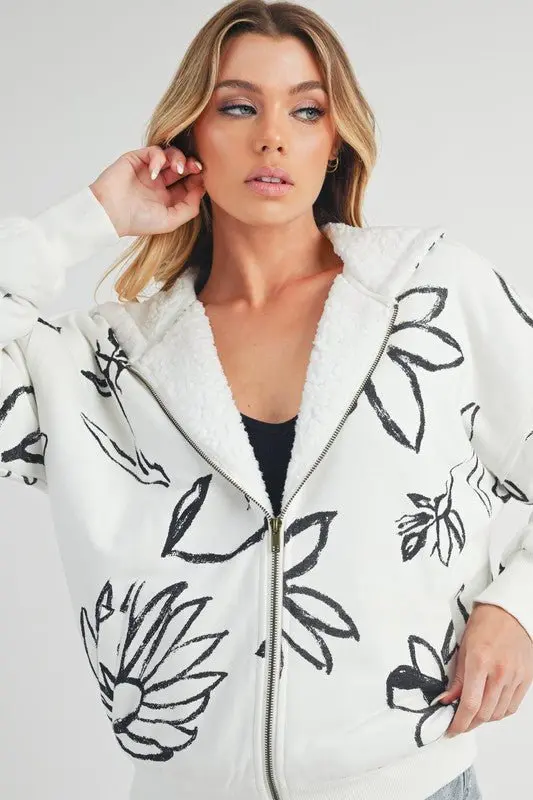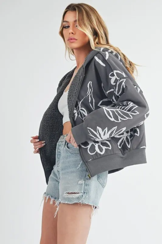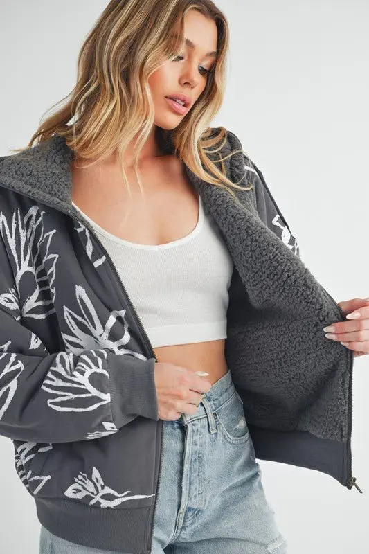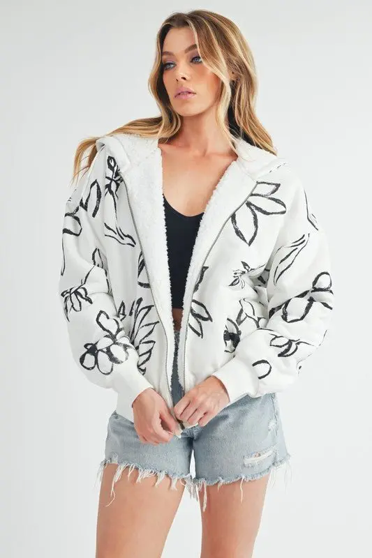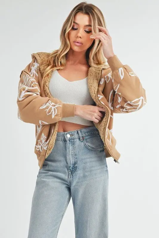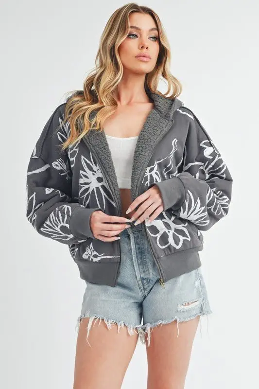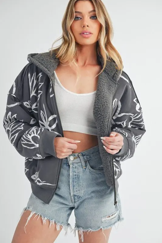 Stay cozy and stylish in the Oita jacket, featuring a bomber silhouette, sherpa lining, front-zip closure, and an oversized fit. Made from soft fabric with printed details, it includes a hood, ribbed bands and cuffs, hand pockets, and dropped shoulders. Elevate your outerwear collection with this standout piece that combines comfort and contemporary design.